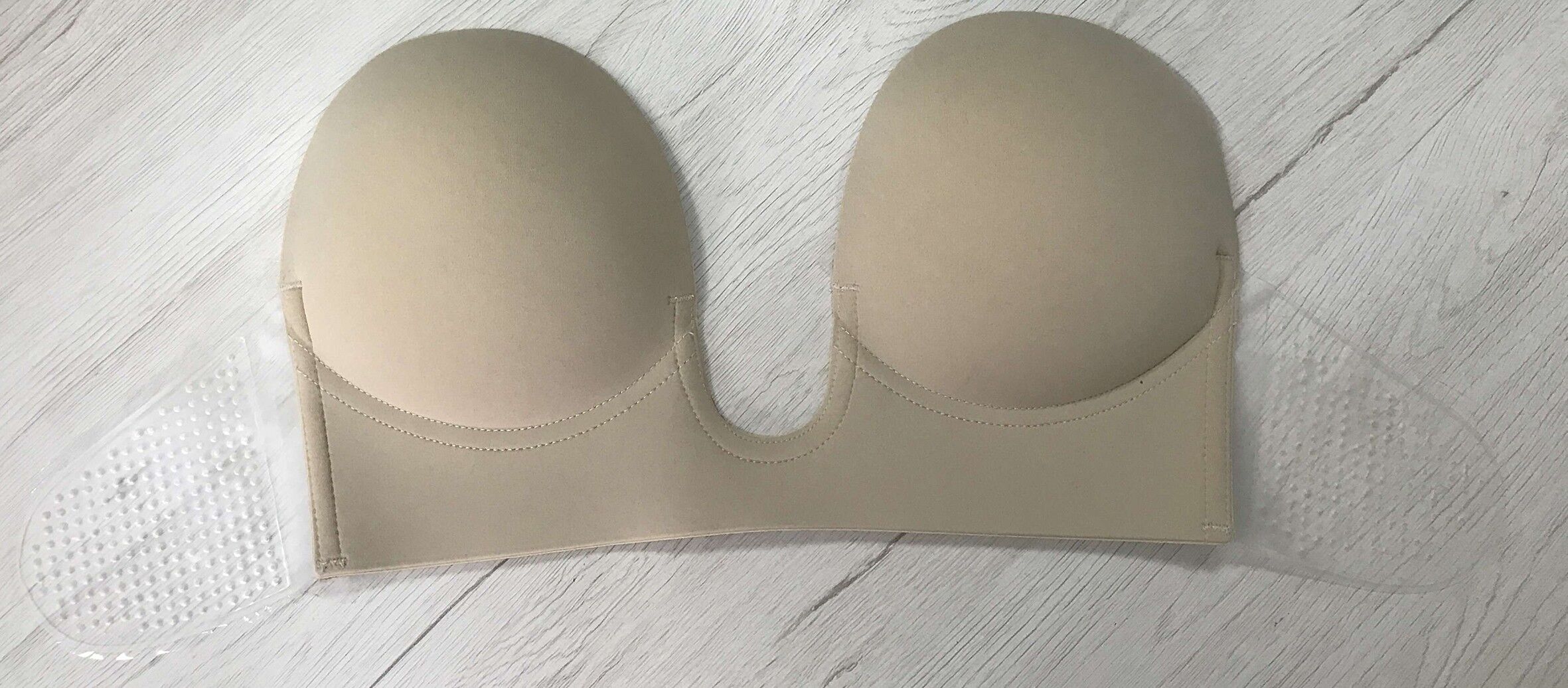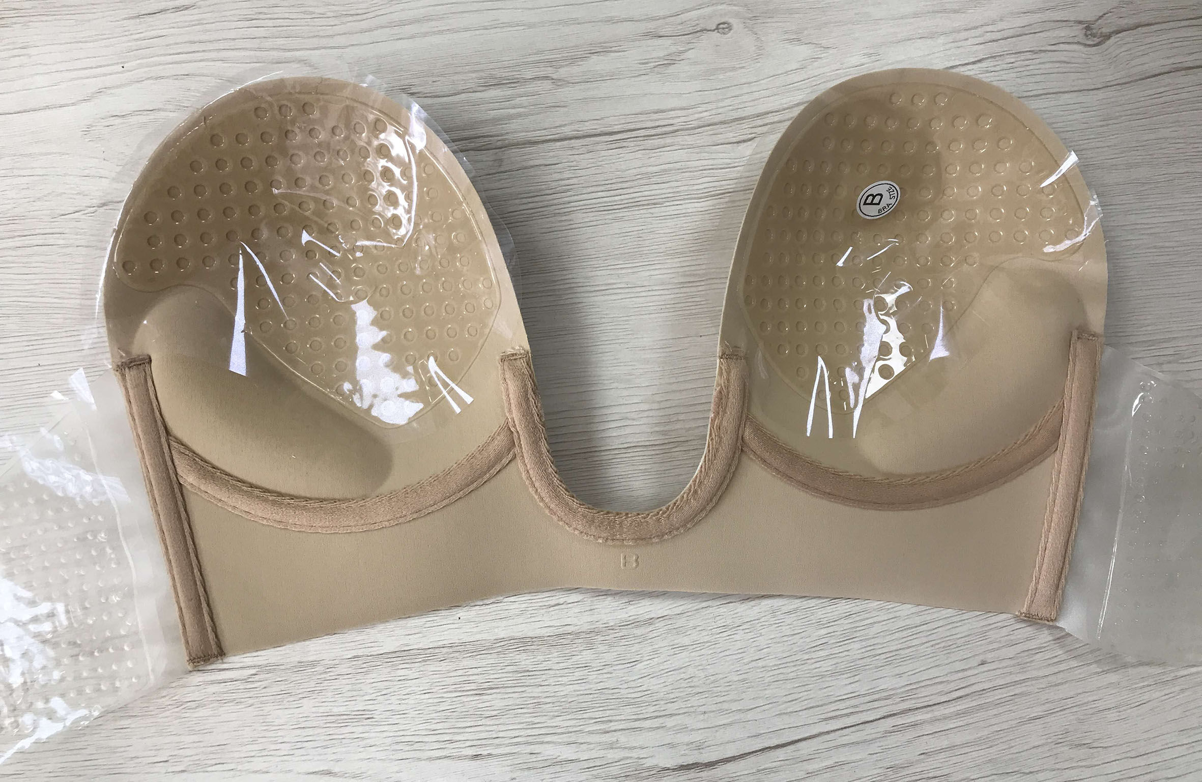 Style no.SB063: Ladies U plunge nylon stick on push up brassiere, with hot melt glue, with transparent sticky wing one right and left side. Natural color A/B/C/D size USD2.70/PC FOB SHENZHEN